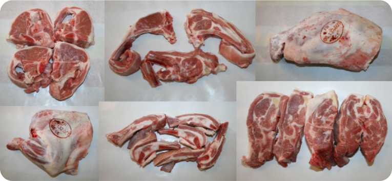 - Agneau : 2 gigots, 2 épaules, des côtelettes, des côtes-filets, poitrine et collier pour un poids total d'environ 15 kg.